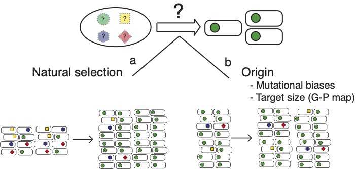 The causes of repeated evolution is not trivial to determine even in laboratory populations. Possibly, only one gene can be mutated to cause a particular adaptive phenotype and then repeated mutations in this gene is the only possible solution. Alternatively, there are several genes that can be mutated, but one give rise to phenotypes with higher fitness and is favoured by natural selection. It is also possible that mutations in several genes give the same high fitness, but that mutations in some genes are more common. A higher mutation rate to a phenotype for a gene could be either because of a larger mutational target size or mutational biases between sites.